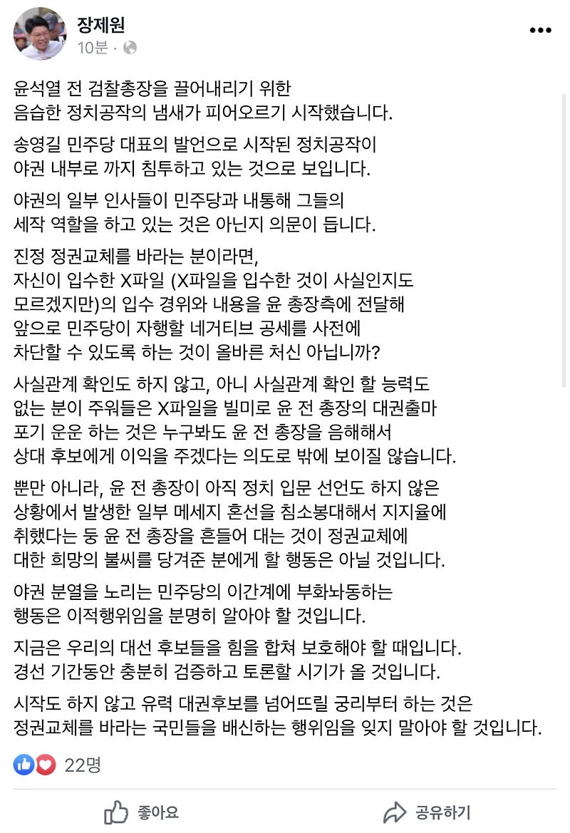 서울=뉴시스 김지현 기자 = 정치평론가 장성철 공감과논쟁 정책센터소장은 19일 페이스북을 통해 얼마 전 윤석열 전 검찰총장과 처, 장모의 의혹이 정리된 일부의 문서화된 파일을 입수했다며 윤 전.